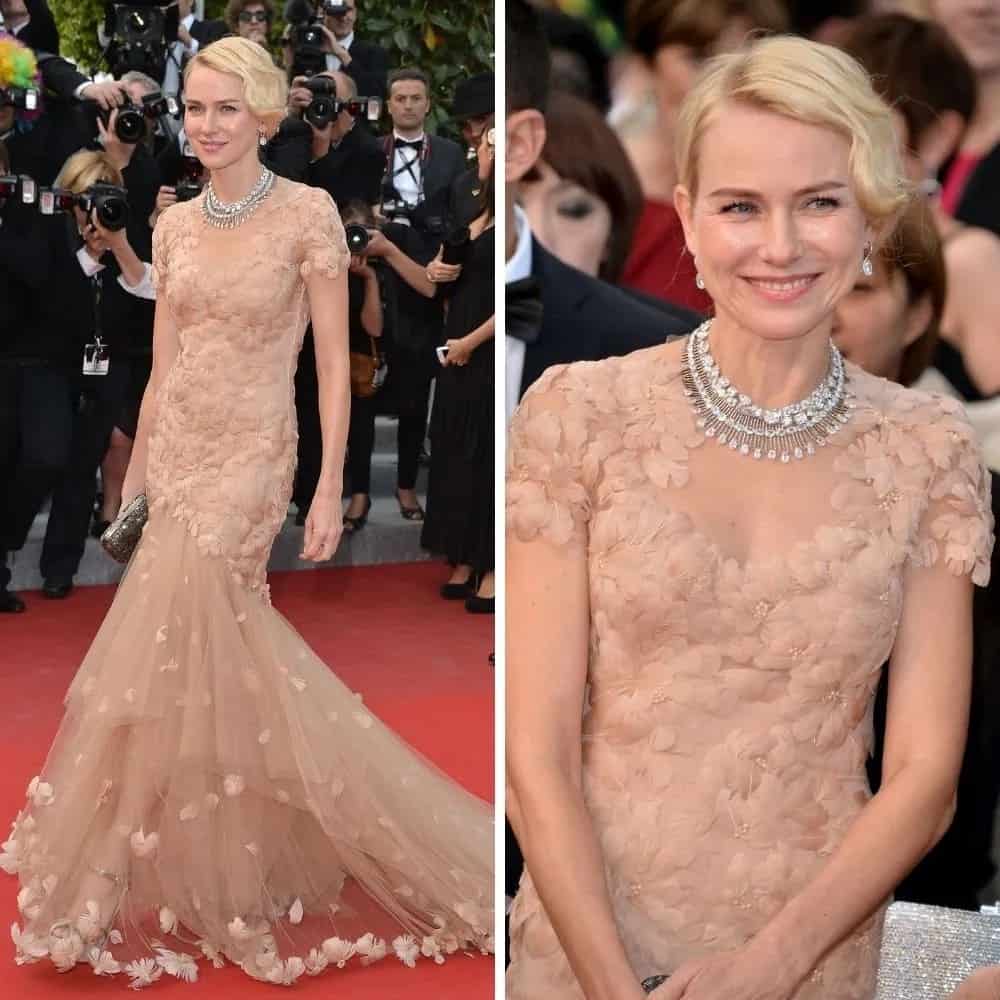 For a red carpet event, Watts wore a stunning nude Marchesa dress with a fishtail finish. Paired with diamond accessories, she effortlessly embodied the essence of Hollywood royalty.