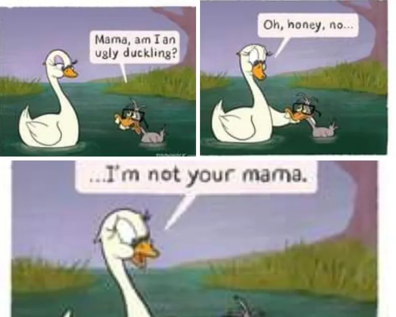 We all know The Ugly Duckling—the feel-good story where an outcast duck turns out to be a beautiful swan. But this comic flips that fairytale on its head with a harsh reality check from a swan who’s not feeling the motherly vibe.