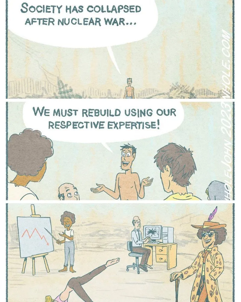 Yoga teachers, marketers, and life coaches might not be the dream team for rebuilding civilization. Without builders or engineers, even basic shelter becomes a pipe dream. It’s a hilarious, painfully honest look at how unprepared modern society might be if we ever really had to start over. Who’s bringing the firewood?
