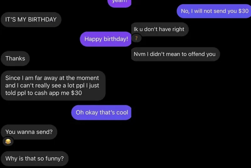 If you have to point out to random “friends” on Facebook that it’s your birthday, then those people don’t know you well enough to be giving you gifts, and especially not straight-up cash. We guess it can’t hurt to try, though.
