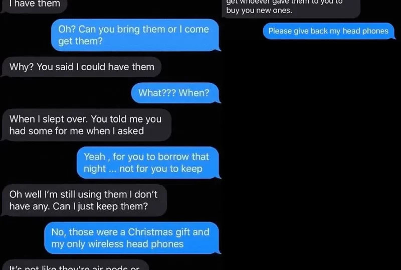 Adult sleepovers with friends can be a lot of fun, unless your friends try to take your things. When this girl was wondering where her headphones went, she messaged her friend to discover she had taken them.