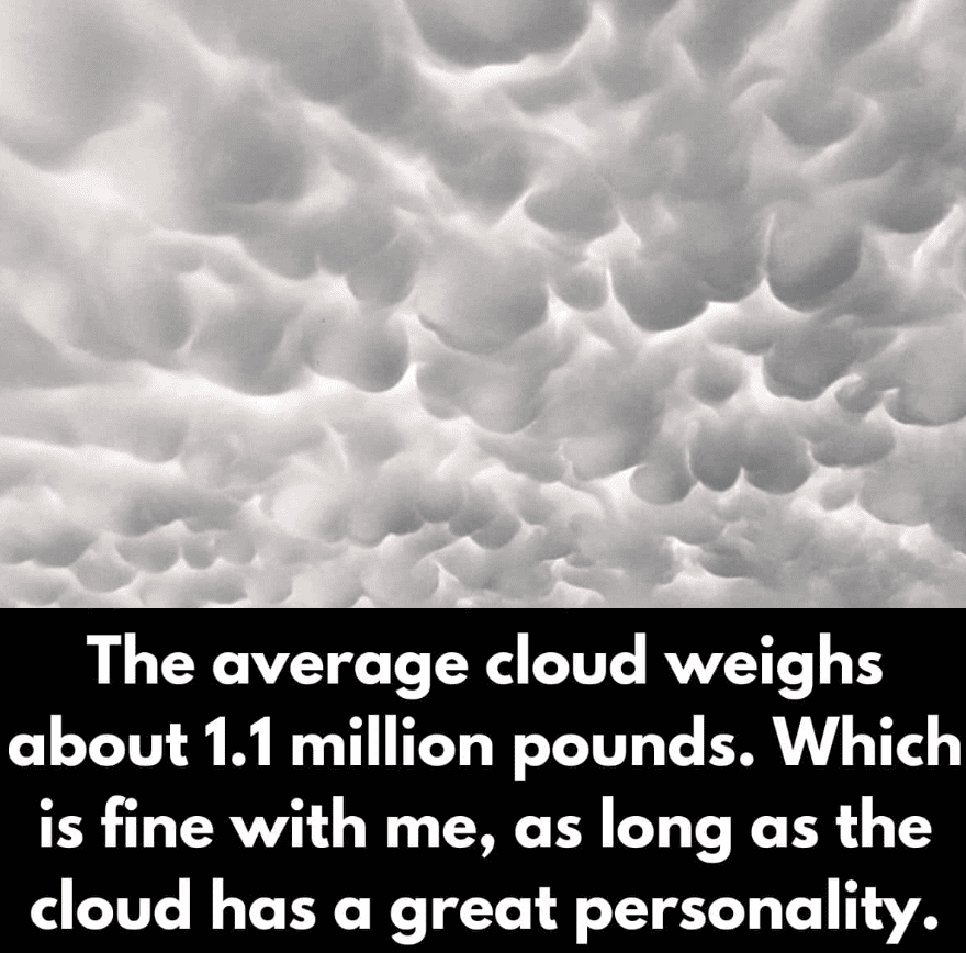 Gazing at the sky, marveling at the fluffy, marshmallowy clouds—those cotton ball-like wonders—can be a wonder-filled pastime. They appear light and ethereal, but appearances can be deceiving. Clouds carry an astonishing weight, averaging about 1.1 million pounds—truly mind-boggling.
