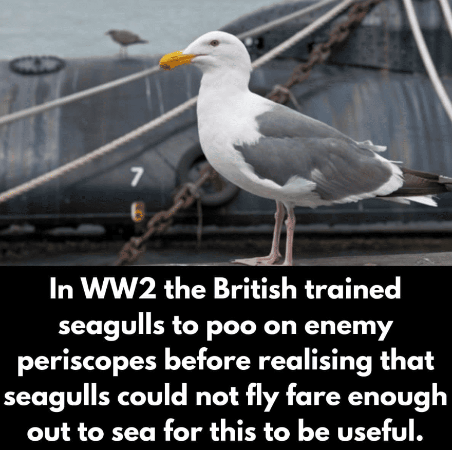 However, this inventive plan encountered an unforeseen comedic twist. Seagulls, while adept coastal birds, could not venture far enough out to sea to make this approach effective against submarines operating in deeper waters. Thus, despite its ingenuity, the plan proved more humorous than practical and was eventually abandoned in favor of conventional anti-submarine measures.