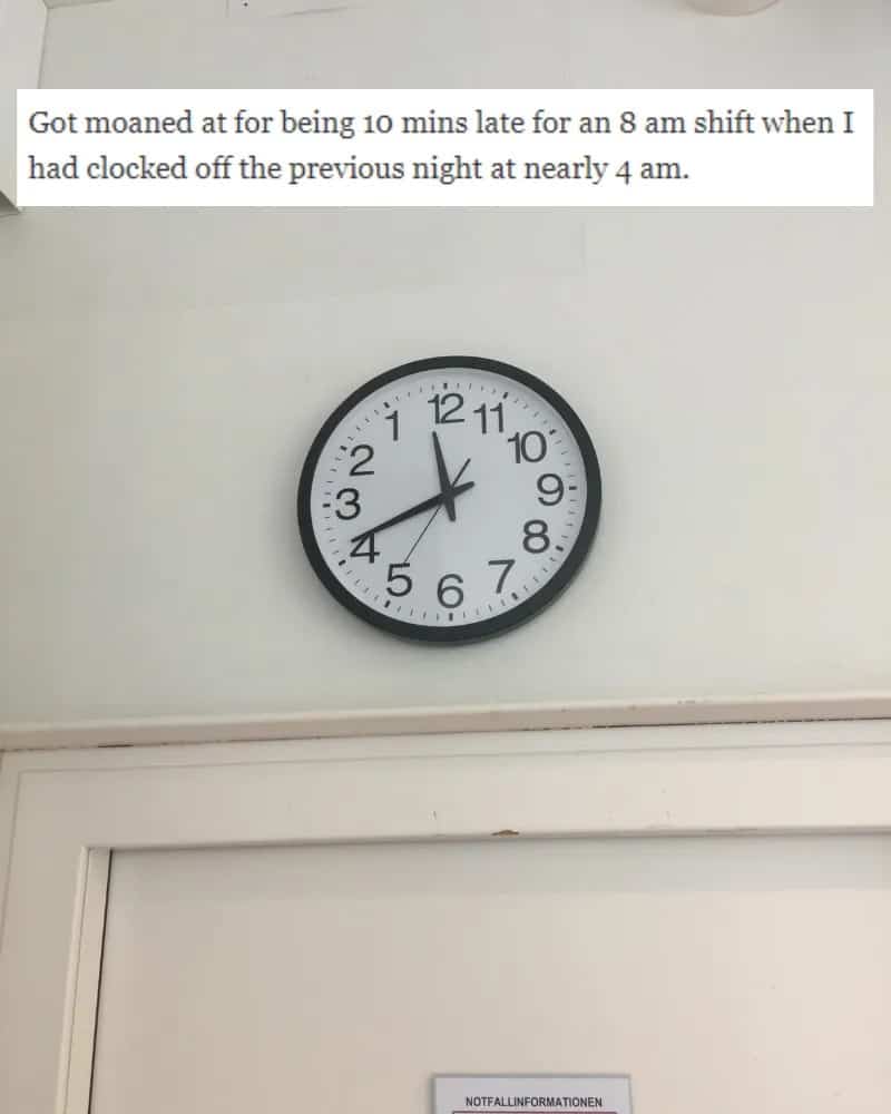 Not only were they reprimanded for minor lateness, but it also happened after they had worked late at the same place the night before. With no time to sleep between shifts, it’s understandable why they might run marginally behind schedule.
