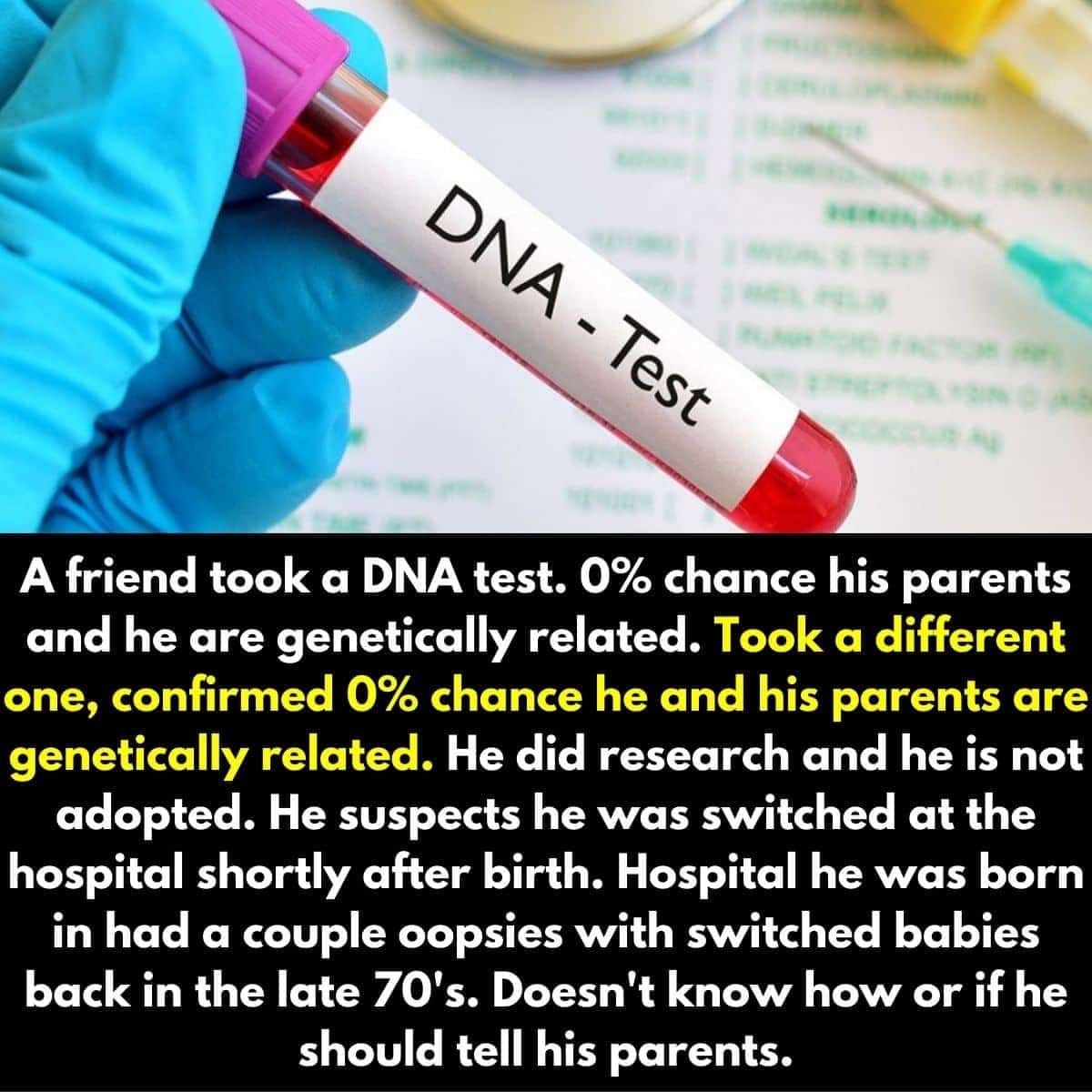 After a DNA test, this person’s friend discovered he shares no genetic relationship with his parents. Allegedly, there were mishaps at the hospital during his birth. This situation can be emotionally challenging, especially if his parents are unaware of the truth.