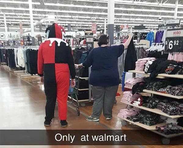 To be fair to this adult man, the photo could have been taken on Halloween. Additionally, Harley Quinn is arguably the more popular character between the Joker and Quinn duo. Nevertheless, seeing him standing next to a normally dressed companion is a bit peculiar. However, he might have missed an opportunity by not carrying a comically oversized hammer, a staple accessory for Harley Quinn. Then again, he could probably find one at Walmart, which might explain the photo.