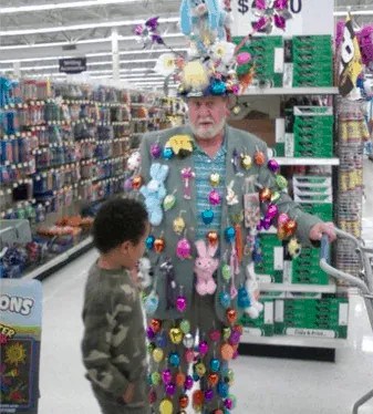 The image quality may be low, but one can still discern this older man’s immense enthusiasm for Easter. While this is an assumption, it’s challenging to imagine any other reason for his attire, adorned with Easter symbols and memorabilia. Once again, the question arises: did he arrive at Walmart dressed like this, or did he utilize items from Walmart to deck himself out in such a manner? If it’s the latter, the store’s employees seemed lenient in allowing him to do so.
