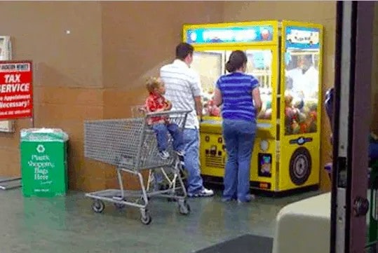 This couple clearly understands the true highlight of Walmart: the chance to try their luck with fun and enticing plushie-grabbing machines! With their cart empty, it’s as if they were momentarily sidetracked from their shopping by the allure of these boxes of pure joy. Then again, perhaps they are simply trying to acquire a toy for their child, making it a rather heartwarming and charming scene compared to the usual Walmart antics.